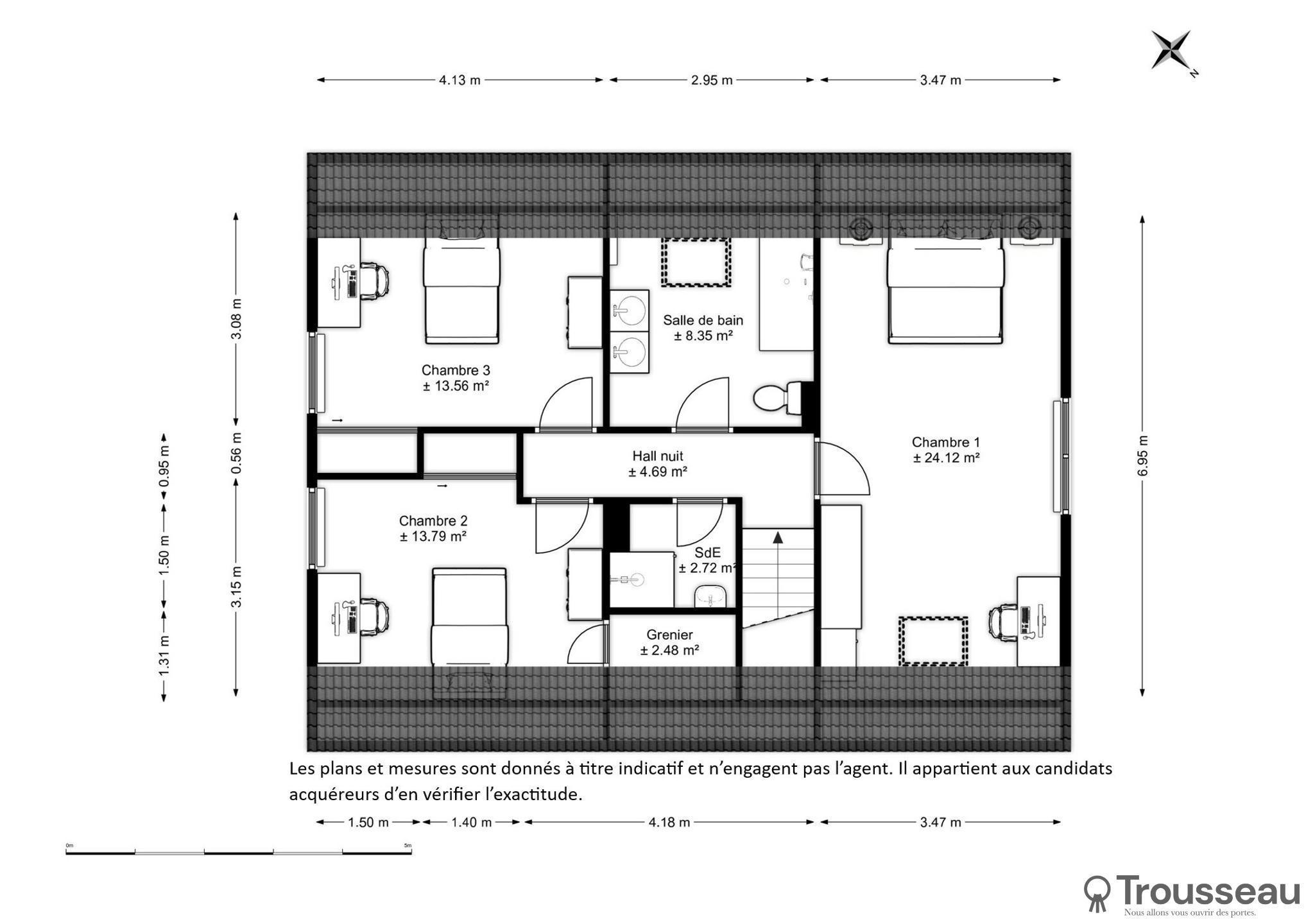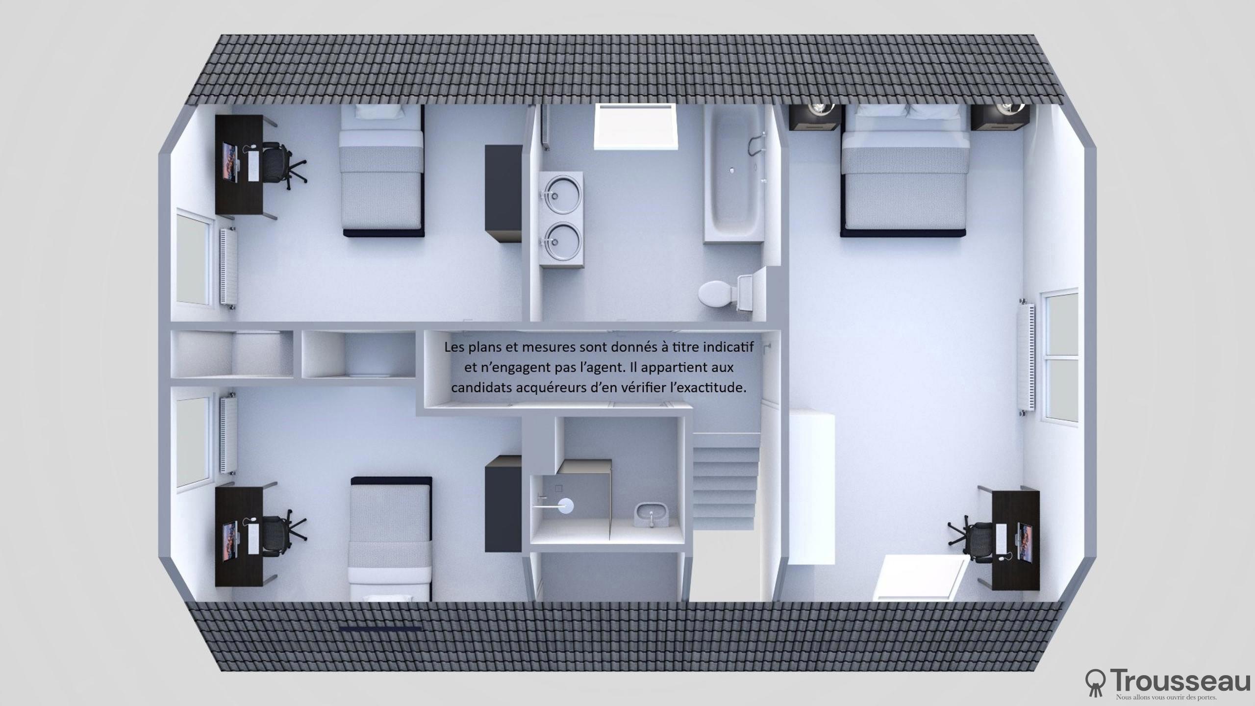 L’étage se compose de 3 grandes chambres, une salle de bain avec WC, une salle de douche, un hall de nuit et un grenier.